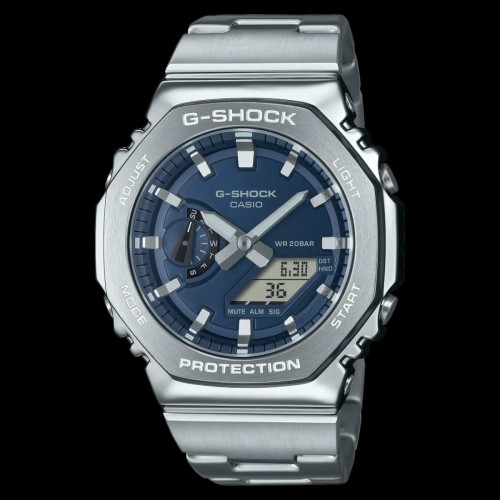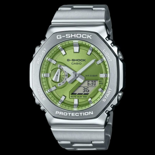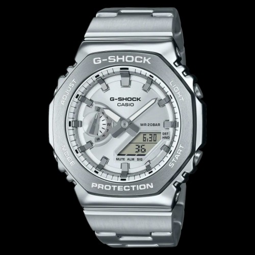 *G-SHOCK GM-2100-ALL WORKING WITH AUTO-LIGHT* Shock Resistant Mineral Glass Neobrite 200-meter water resistance Case / bezel material: Resin / Stainless steel Resin Band Double LED light LED light for the face (Super illuminator, selectable illumination duration (1.5 seconds or 3 seconds), afterglow) LED backlight for the digital display (Super illuminator, selectable illumination duration (1.5 seconds or 3 seconds), afterglow) Hand shift feature (Hands move out of the way to provide an unobstructed view of digital display contents) World time 31 time zones (48 cities + coordinated universal time), daylight saving on/off 1/100-second stopwatch Measuring capacity: 00'00''00~59'59''99 (for the first 60 minutes) 1:00'00''~23:59'59'' (after 60 minutes) Measuring unit: 1/100 second (for the first 60 minutes) 1 second (after 60 minutes) Measuring modes: Elapsed time, split time, 1st-2nd place times Countdown timer Measuring unit: 1 second Countdown range: 24 hours Countdown start time setting range: 1 second to 24 hours (1-second increments, 1-minute increments and 1-hour increments) 5 daily alarms Hourly time signal Hand shift feature Full auto-calendar (to year 2099) 12/24-hour format Button operation tone on/off Regular timekeeping Analog: 2 hands (hour, minute (hand moves every 20 seconds)), 1 dial (day) Digital: Hour, minute, second, pm, month, date Accuracy: ±15 seconds per month Approx. battery life: 3 years on SR726W × 2 LED:White All Self Clicked Picture and Video